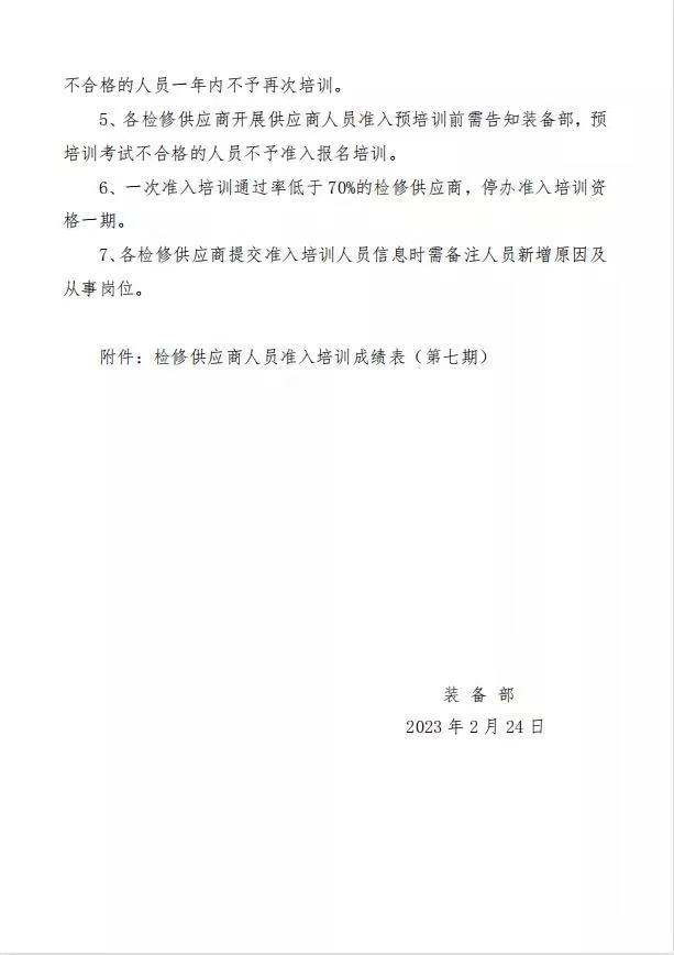 2023年2月23日裝備部組織開展第七期檢修供應商人員準入培訓。武漢鼎業與其他單位共36人參加培訓考試,其中31人培訓考試合格,合格率為86.1%。